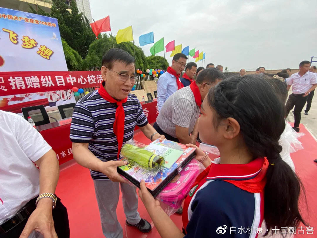 在捐助仪式上,陕西杜康酒业集团向纵目中心校88名留守的青少年送上了价值3万元的教学物资