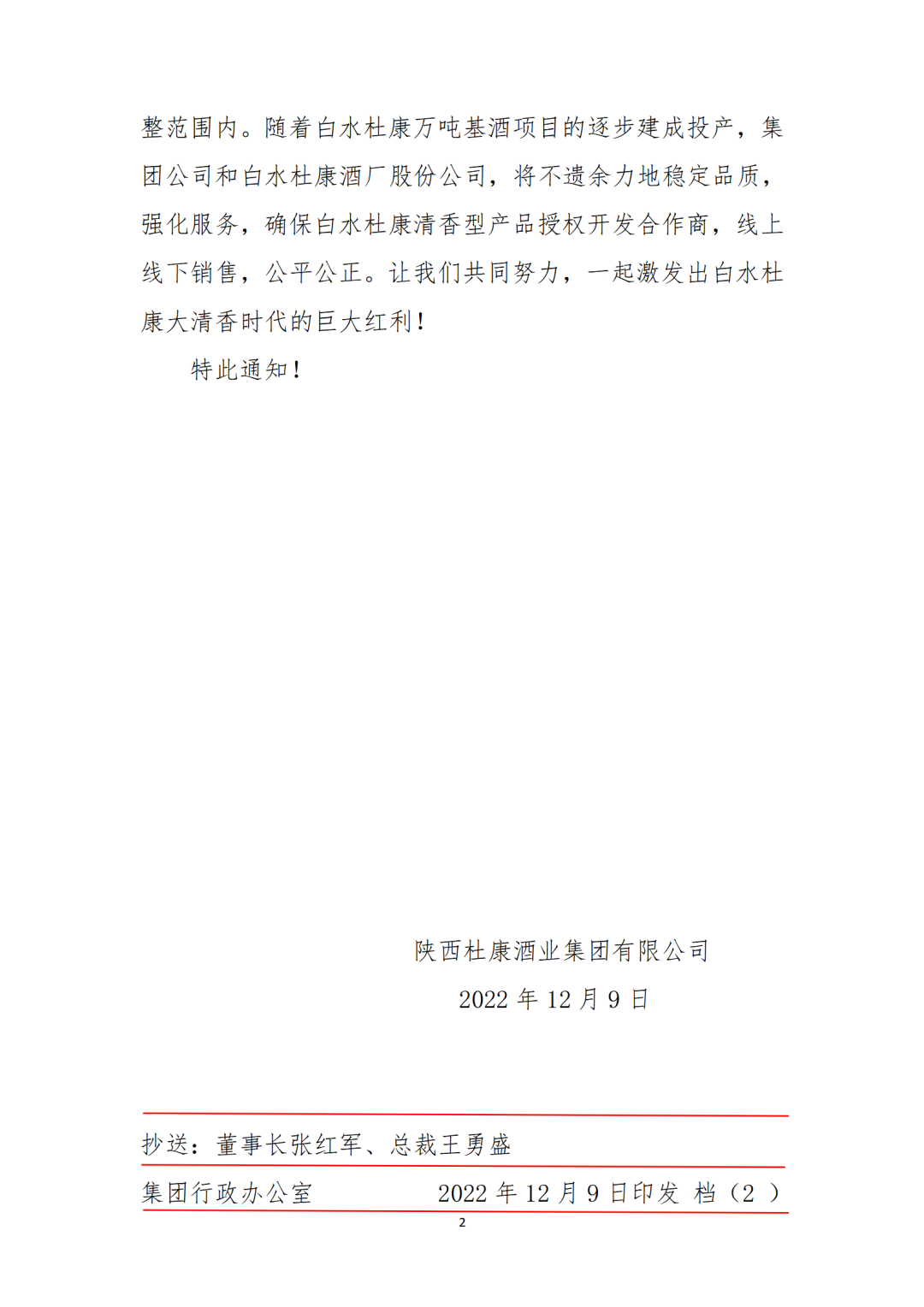 陕西杜康酒业集团有限公司关于停止浓香型开发产品线上授权的通知