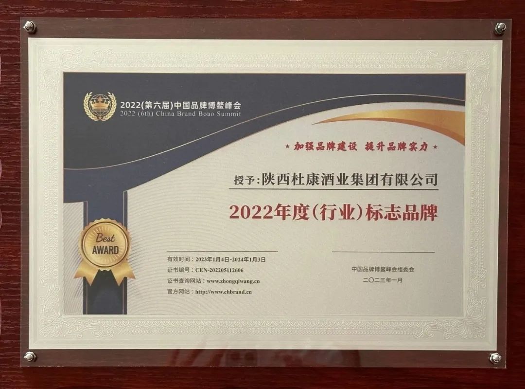 陕西杜康酒业集团有限公司荣获"2022年度(行业)标志品牌"