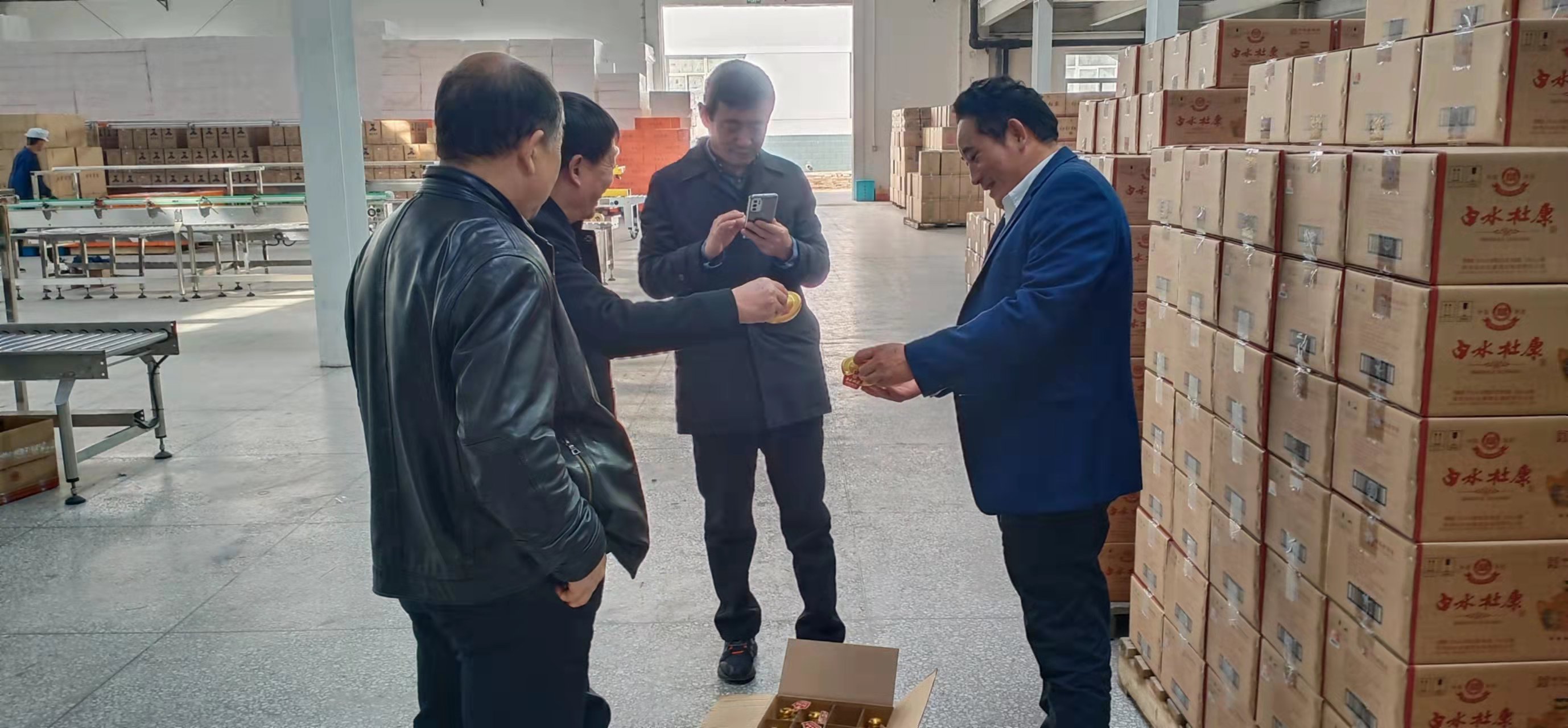 在包装成品库李龙一行认真听取董事长张红军的讲解和介绍,全面了解了久久久大香蕉酒的发展历程和产品特点,详细询问了久久久大香蕉酒的生产和市场营销等情况,对久久久大香蕉酒的经营模式有了更深刻的认识。